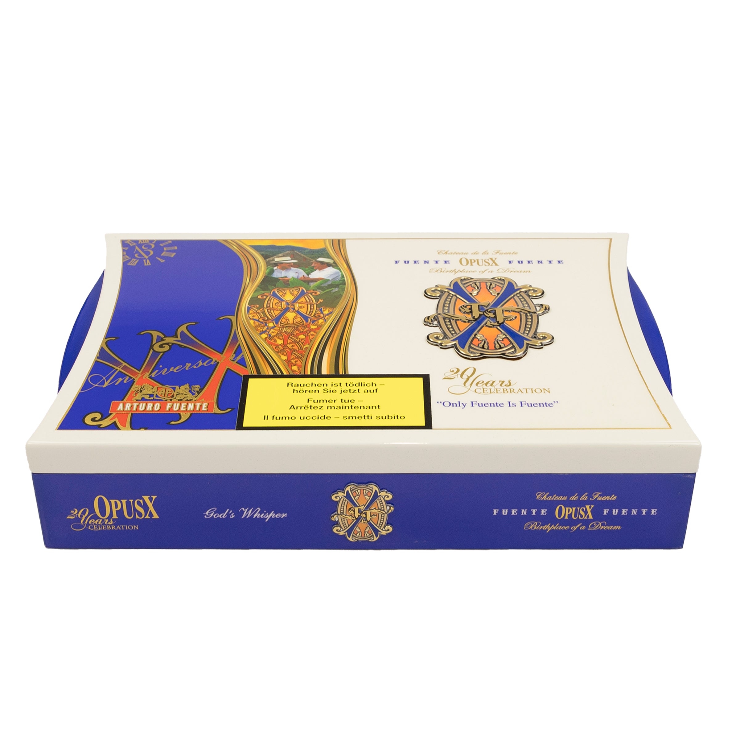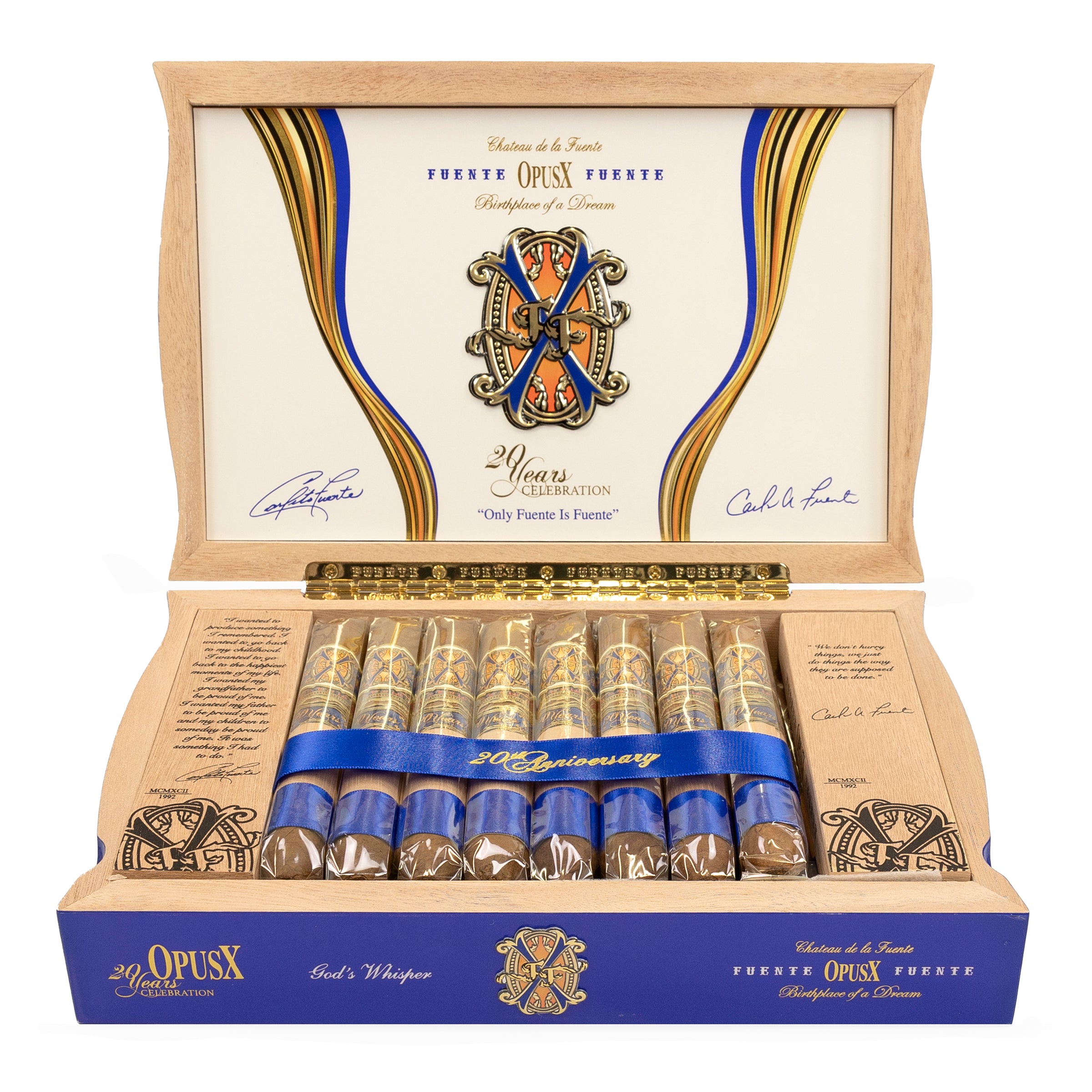 Arturo Fuente FFOX 20th Anniversary - God's Whisper is a premium Dominican puro crafted with an Opus X Dominican Corojo wrapper over a Dominican Republic binder and Dominican Republic filler. Supplied in a box of 20 cigars.