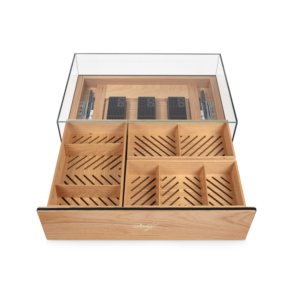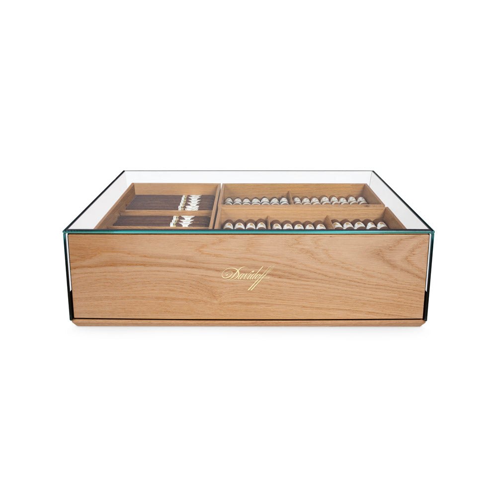 A push-to-open lid, three separate trays and three Davidoff De Luxe regulators support stable humidity and a practical daily routine.