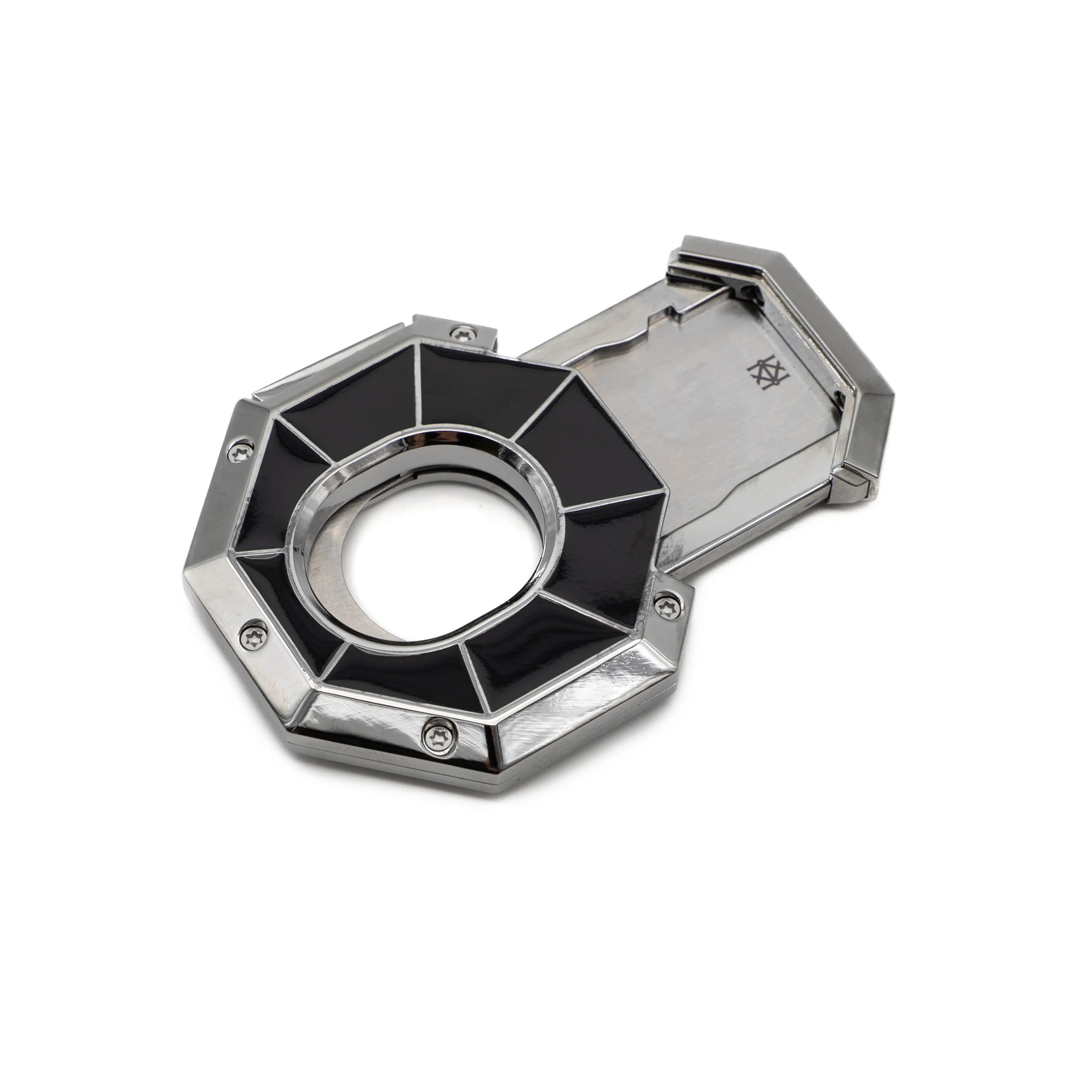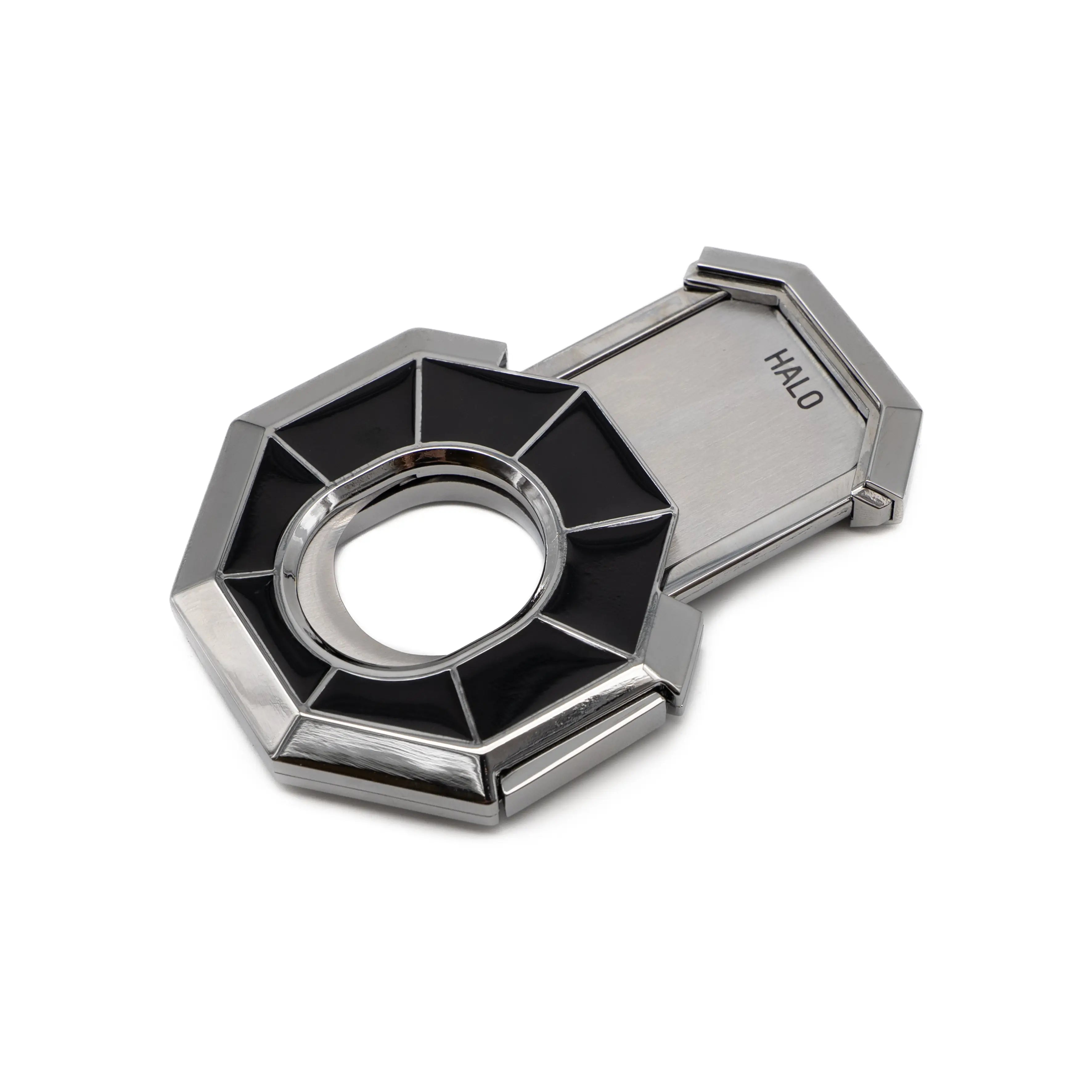 The HALO Cigar Cutter is an elegant, striking jewel sculpted in a gleaming octagonal case with exquisite enamel accents. A discrete spring-activated button releases the double-bladed guillotine, delivering a cut of effortless precision and poise.